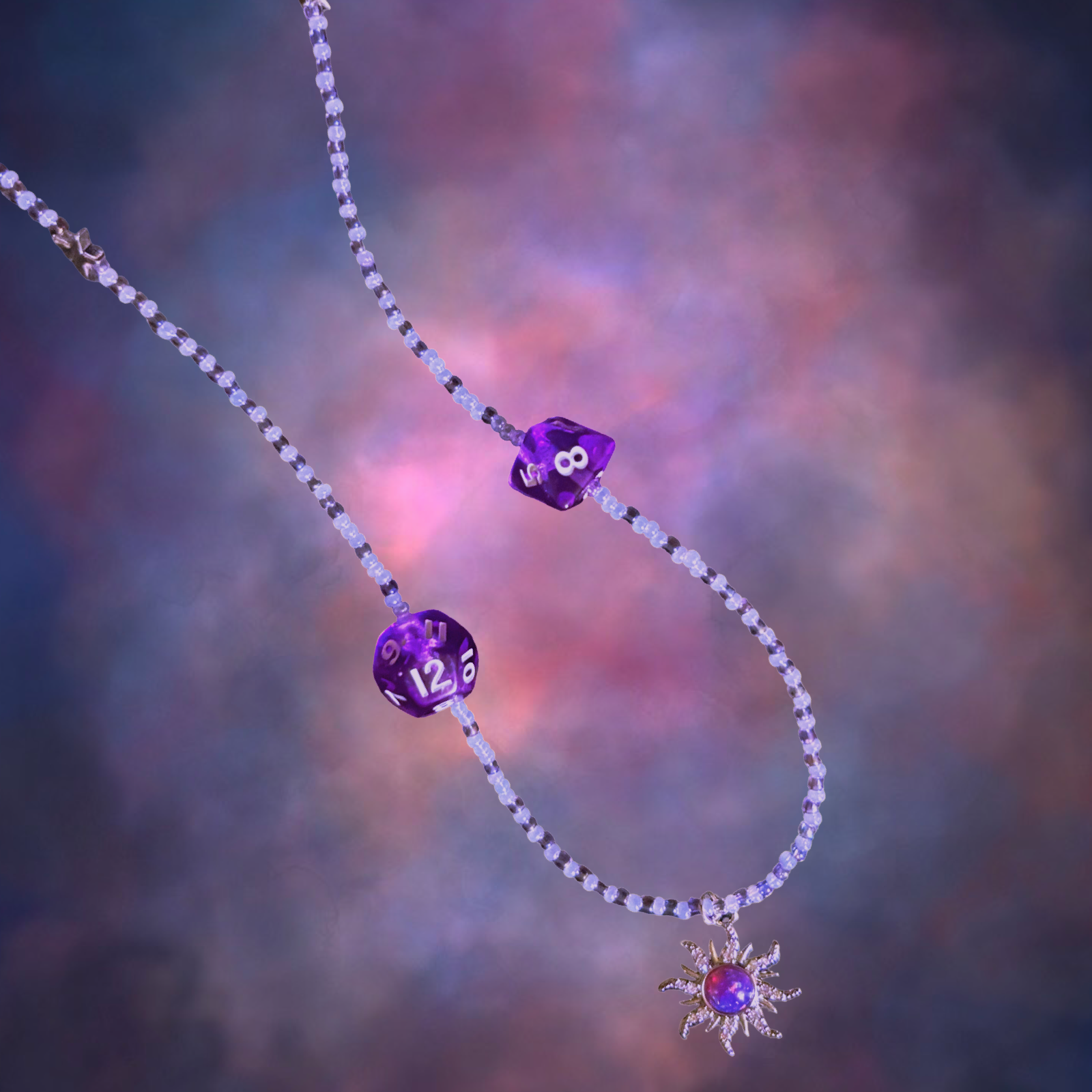This dreamy necklace features shimmering purple D8 & D12 accents and a radiant star charm, capturing the feeling of rolling fate beneath a sky full of constellations.